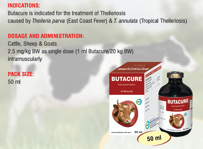 Butacure is indicated for the treatment of Theileriosis caused by Theileria parva (East Coast Fever) and T. annulata (Tropical Theileriosis).