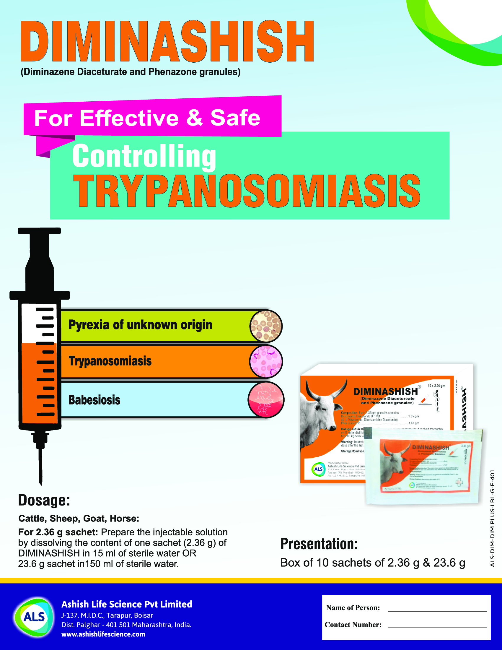Diminashish Plus contains Diminazene Diaceturate along with Vitamins B6 and B12 formulated for the control of Trypanosomiasis and pyrexia of unknown origin in cattle. This product aids in the management of protozoal infections and supports the killing of Trypanosoma parasites. Presented in soluble granule form for injection, it is designed to be administered following veterinary guidance. Medical disclaimer: This product is intended for veterinary use only and should be used under veterinary supervision. It is not for human use and does not replace professional diagnosis or treatment.