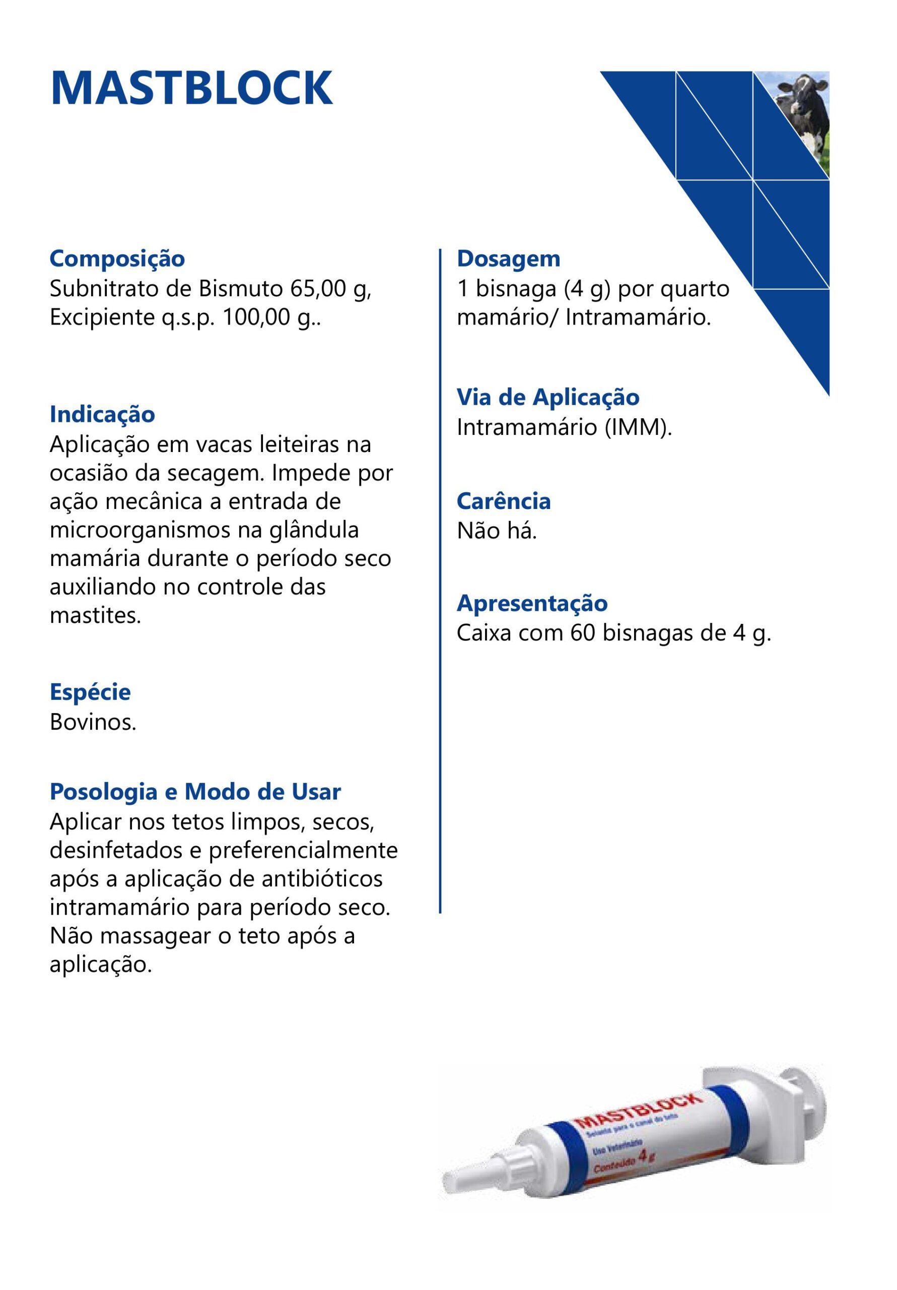 Mastblock is designed to prevent the entry of microorganisms into the udder during the dry period. It helps control mastitis effectively.