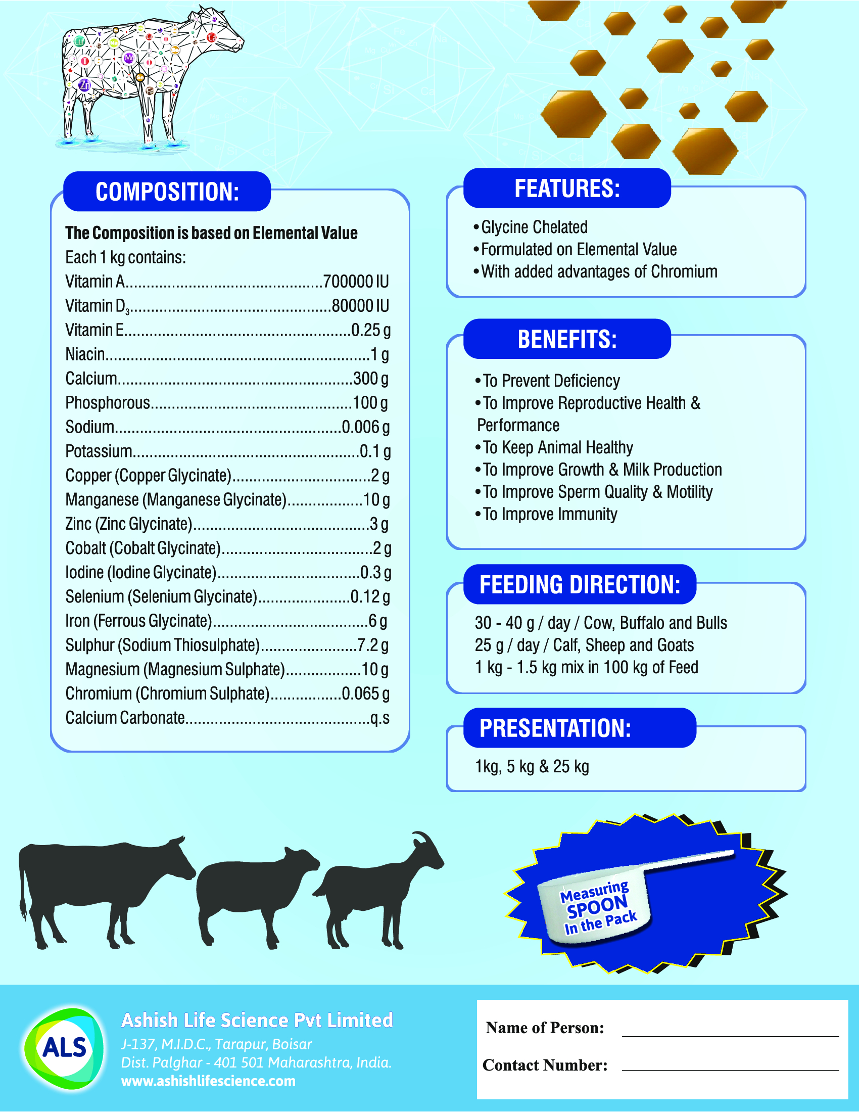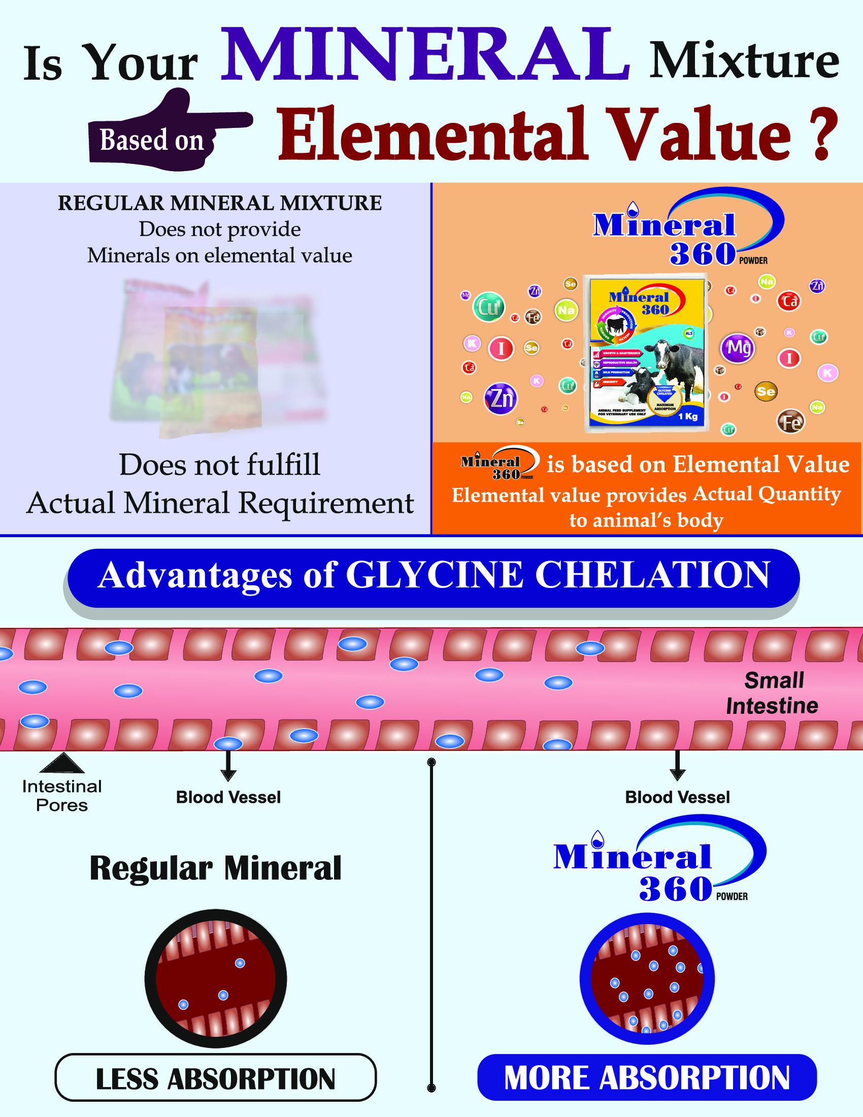 Mineral 360 is a glycine chelated mineral mixture based on elemental value designed to support animal health in cows, buffalo, bulls, calves, sheep, and goats. This veterinary supplement offers benefits such as prevention of deficiency, enhancement of reproductive health and performance, promotion of growth and milk production, improvement of sperm quality and motility, and support of immunity. It is supplied with a measuring spoon for accurate feeding according to specified daily directions. This product is intended for veterinary use only. Medical Disclaimer: This product is a supplement for animal nutrition and is not intended to diagnose, treat, cure, or prevent any disease.